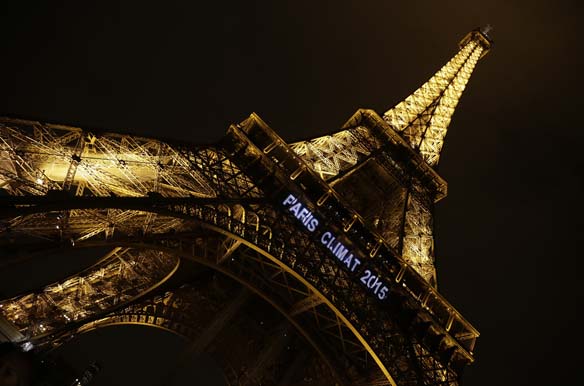 Lights on the Eiffel Tower read, “Paris Climat 2015” to mark the selection of the Paris to host the United Nations Framework Convention on Climate Change Conference of Parties in 2015 (Jacky Naegelen/ Courtesy Reuters).